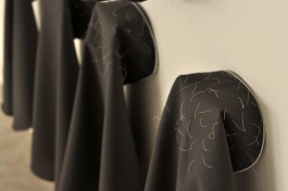 Seven nuns' veils are hanged on a wall. From the upper part of each veil come out fluorescent threads reminiscing hair.